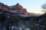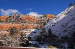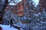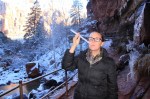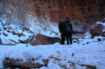 Man, we thought it was cold in the Grand Canyon but we didn’t know what cold was until we reached Utah highlands, where Zion National Park is located. It was -10 degrees Celsius during the day and -17 overnight where we camped. We woke up to ice on the inside and the outside of the windows of our campervan and our bottled water frozen. We made it through the night wearing nearly every item of clothing we had and five blankets. The scenery was amazing, bright orange canyons dusted with fluffy white snow. We hiked in cold icy conditions to Emerald pools where Sharni stacked it butt down on the icy path. We both had several more near misses sliding on our feet.