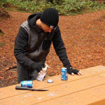 hand sanitizer and an empty beer can to light the fire