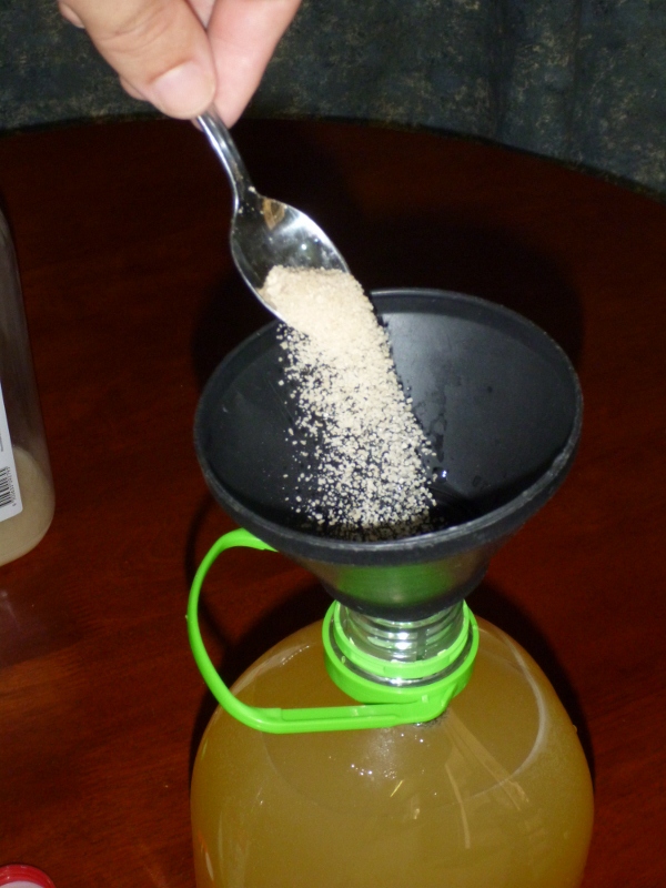 – Add 4 heaped teaspoons of sugar into the newly decanted brew. The sugar will carbonate the cider, making it bubbly like the finest champagne. The final portion of the fermentation process will be done with a sealed vessel so that the carbon dioxide produced will go into solution with the cider and form an effervescent drink. Add slightly more sugar if you want a more bubbly cider.