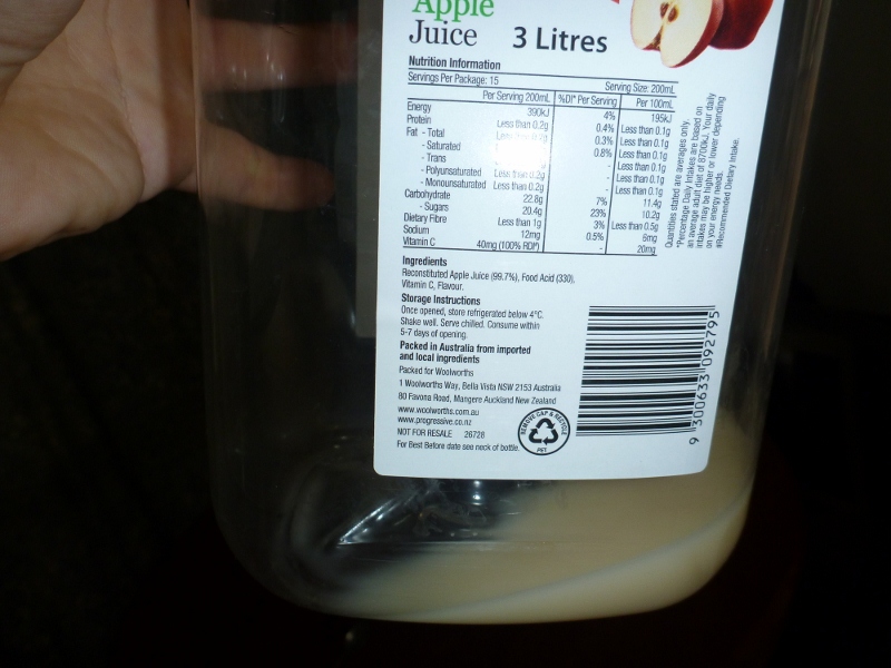 – 3L of preservative free long life apple juice (in its original 3L bottle).