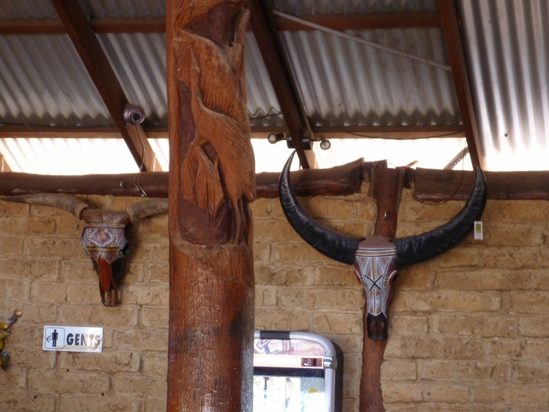 Pine Creek is a small mining town north of Katherine, just under halfway to Darwin and a couple of km off the Stuart Highway. There’s a gem of a pub there – The Lazy Lizard. Big outdoor character pub, timber and stone structure, modern comfortable furniture, big logs for structural posts, aboriginal art on the walls and sculptures carved into some of the wooden posts. There’s pool tables and TVs displaying MTV. Plus it’s kept really clean and tidy, one of the highest standards we’ve seen for an outdoor style outback pub. Good spot. I wish Katherine had something equivalent.