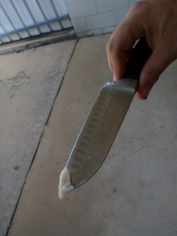 The offensive smell emitted by the ripe fruit is trully impressive. It needs to be smelt to be believed. The smell is similar to rotting blue vein cheese, with a hint of burn similar to ammonia or sulfur. The first time I picked these fruit, they were white but hard and did not smell. I left them on the kitchen table for a couple of days to ripen. One morning I awoke to a repulsive stench permeating through the house. I thought maybe something had gone bad in the bin. I followed the scent trail which of course led to the fruit. Just before ripening they are firm and do not smell. They ripen suddenly, becoming soft and extremely stinky.