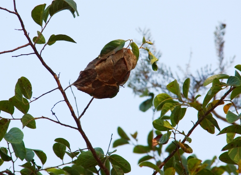 If you’ve wondered around the bush in Northern Australia then you’ve probably bumped into these aggressive little guys. Their common name is green ant, green tree ant or weaver ant, scientific name Oecophylla smaragdina, and they’re distributed across the top end of Australia through open woodland. You’ll see them busily crawling over branches and through the bush. I wondered what the nests were when first coming to the top end and was surprised to find out they were ants nests. The ants build their nests in trees by folding or weaving green living leaves and gluing them together using larval silk to form a cluster about the size between a human fist and a human head. They are highly aggressive and will attack anyone approaching or interfering with their nest. Their eyesight is good, as evidenced by their instant rearing onto hind legs with mandible (pinchers) aggressively in the air whenever approached. They do not have a sting but can inflict a painful bite with their pinchers, followed by a squirt of acid for added pain. Their bodies are orange in colour, with a bright translucent green abdomen (actually called the gaster).