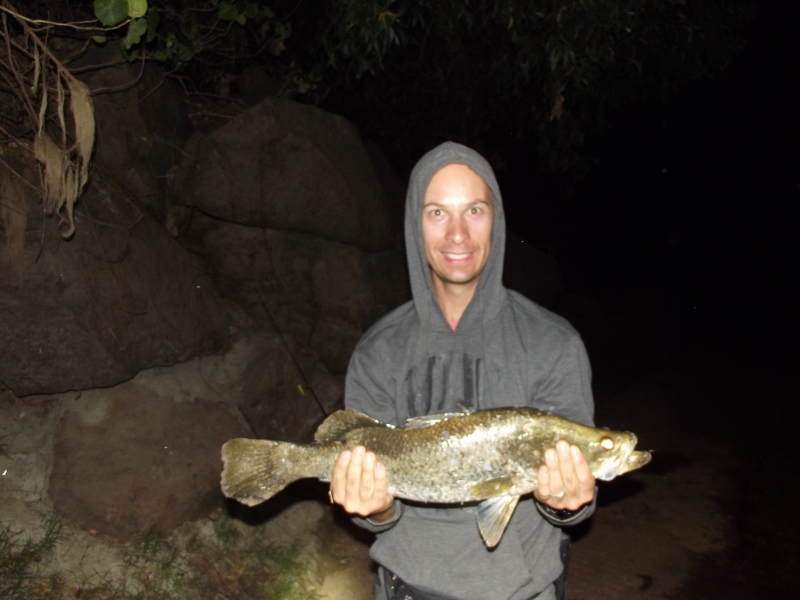 My first sized barramundi, caught at night at Shady Camp. Barely legal, but good enough.