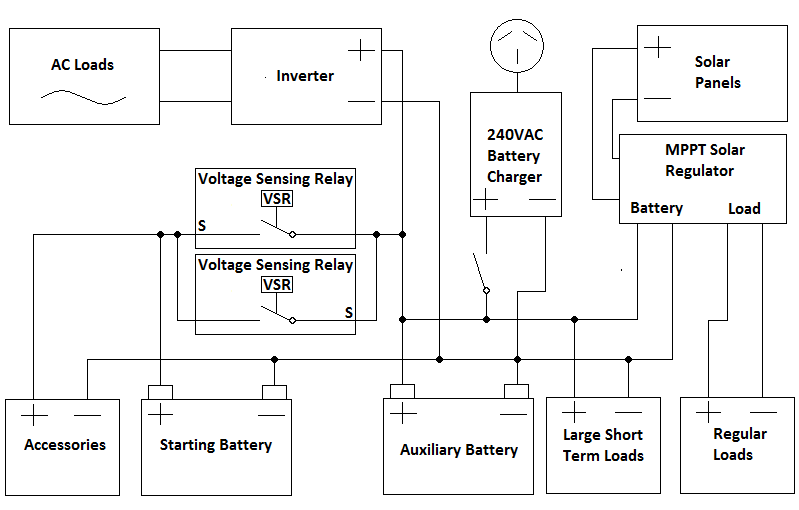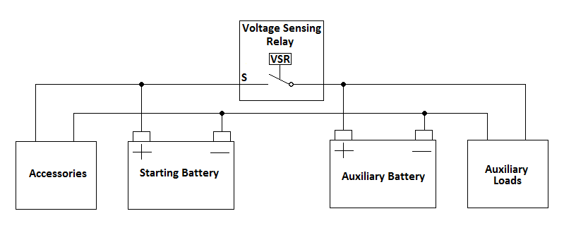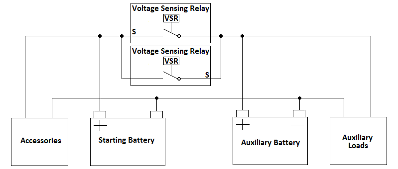 If you have some sort of charging system for your auxiliary battery (eg solar panels), the single voltage sensing relay has a drawback. Once it opens, it prevents your charging system from charging your starter battery, and your starter battery will be slowly depleted by your vehicle’s accessories. Adding a second voltage sensing relay in the reverse direction resolves this issue. The batteries will be joined if the voltage on either side is high enough. So once your charging system has charged your auxiliary battery, the second voltage sensing relay will close and your starter battery will be charged. Apart from avoiding depletion of your starter battery, this arrangement allows your starter battery to contribute to your power use every charge / discharge cycle, so you have some extra capacity to run your loads longer, and it allows the auxiliary battery to contribute to starter motor cranking. It also reduces the depth of discharge on your auxiliary battery, resulting in a net reduction in battery wear across the two batteries. It, if the charging system on the auxiliary side permits, also gives your starting battery an occasional higher charge voltage above the standard voltage of the alternator, which reduces sulfation and extends battery life. There are dual voltage sensing relays available that perform this function as a single unit – closing when either terminal is a high enough voltage. So the system can be arranged with either two standard voltage sensing relays or one dual voltage sensing relay.