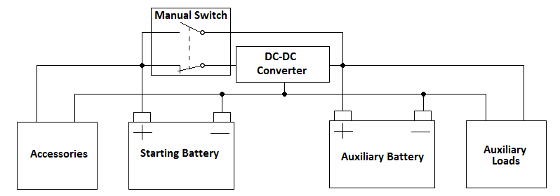 Some of the disadvantages of the DC-DC converter is that it does not allow your auxiliary battery to contribute to starting your motor, will not allow a charging system on your auxiliary battery to charge your starting battery and charges too slowly during the bulk charge phase of a depleted battery. A solution is to add an extra relay that directly connects your batteries, bypassing the DC-DC converter. The relay would be manually activated whenever you need the batteries directly connected. The relay needs two contacts of opposite sense – one to connect the batteries together and one to open the supply to the DC-DC converter. This shuts off the DC-DC converter, preventing damage which could result from shorting the input and output of the DC-DC converter. The DC-DC converter may protect itself from destruction if its input and output are shorted but it’s a good practice to disconnect the DC-DC converter when shorting.