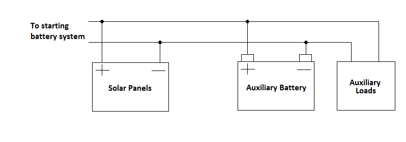 This system is simple to install and minimizes costs. The alternator will charge both batteries and all loads will be shared between both batteries. Both batteries will contribute to cranking the starter and both batteries will provide capacity to run the auxiliary loads. The main problem with this arrangement is that the starter battery will be depleted by the auxiliary loads, after which the vehicle will be unable to start. An easy solution is to manually disconnect the starter battery as required. This is the arrangement I used in my early years of camping. The starter battery in my vehicle had round terminals that were tapered in shape. This meant I could leave the nuts on one of the terminals slightly loose, and with some shuffling back and forth of the terminal I could wedge it hard enough onto the tapered battery terminal to provide a good enough connection, or I could disconnect the terminal as required without needing any tools. You run the risk of forgetting to disconnect the starter battery and allowing it to go flat. If you use this setup, ensure you disconnect the negative terminal only to prevent accidental short circuiting of the auxiliary battery on the body of the vehicle, and obviously do not allow the loose negative terminal to touch the positive side of the battery, unless you are trying to start a fire.