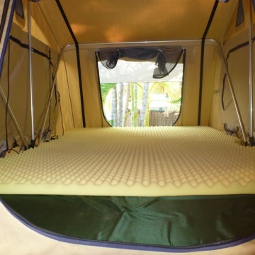Roof top tent with standard mattress and egg shell mattress on top.