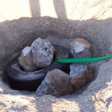 Burying the spare tyre to act as a winch anchor. Some rocks are thrown in for good measure.