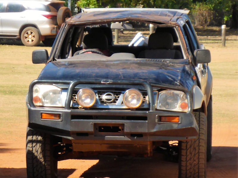 Upside-down Prado with it’s roof largely in tact. Photo taken on Cape York Peninsular.
