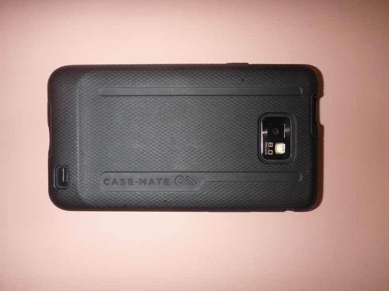 Back of Samsung Galaxy S2 with protective case installed, covering the antenna port hole.