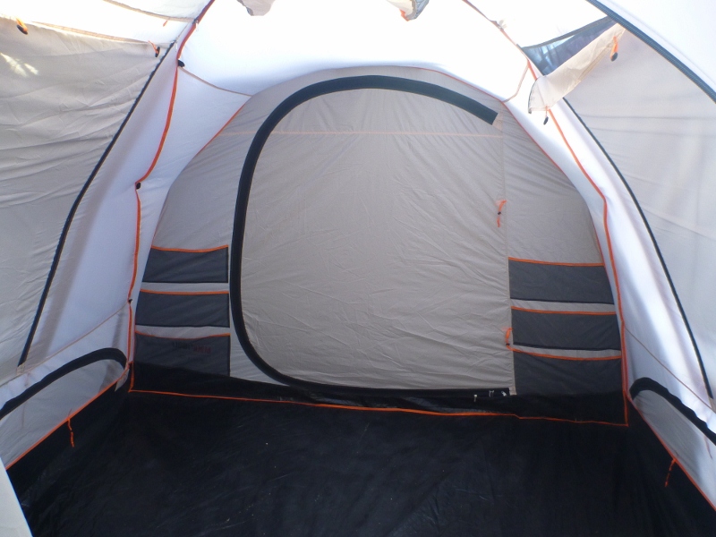 Review: This tent is big. It has two rooms and an annex. It easily fits 6 people with room to store bags etc. It’s high enough to stand in easily and the walls are steep sided giving plenty of head room. The poles are thick and strong and the tent is pretty sturdy especially when the guy ropes are pegged. The outer fly tends to sag a little without guy ropes. I think it’s pretty easy to set up given it’s size but still is quite a bit more difficult to set up compared to smaller dome tents. It’s best to have two people to set it up. Internally it has a few good features – lots of pockets, curtained sky panels, an access point for a power cord, heaps of windows and ventilation, a shelf that hangs from the roof and a couple of zip-up storage areas in the bottom front corners.