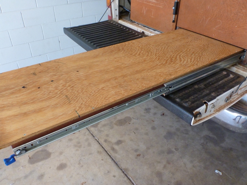 Review: These sliders are expensive but are heavy duty and perform well. They are 100% full extension runners. When extended with a fully loaded fridge chock a block with beer, they feel sturdy and secure. I had one problem with one of the locking latches breaking off, I think due to repeated slamming it shut with a lot of inertia from the fridge. I repaired by re-fixing the latch with a screw in the same spot that it was initially riveted to. The other annoying feature is that it requires two hands to open – one on each release latch. They are rated to 170kg, but come under the 227kg range of sliders. The 227kg range all have the same construction, but longer sliders have a load derating.