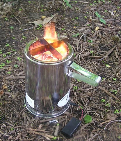 Wood Gas Burner XL – gassifying wood burning camp stove. You can easily cook using as little as a bunch of twigs! It has an integrated fan in the bottom which forces air through the unit and provides a clean, hot burn. A nice way to efficiently use poor quality fuels like leaves and twigs to create a strong clean flame. High output combined with low smoke and soot means it is a great cooking stove. Leaves very little soot on pots if at proper operating temperature. It can however be tedious to light and can go out if not started correctly or the fuel is not kept topped up. We haven’t used this as much as we would have liked, mainly because we haven’t mastered lighting it and it would often go out and start smoking. It needs to be started in a way that produces a strong burn straight away.