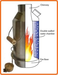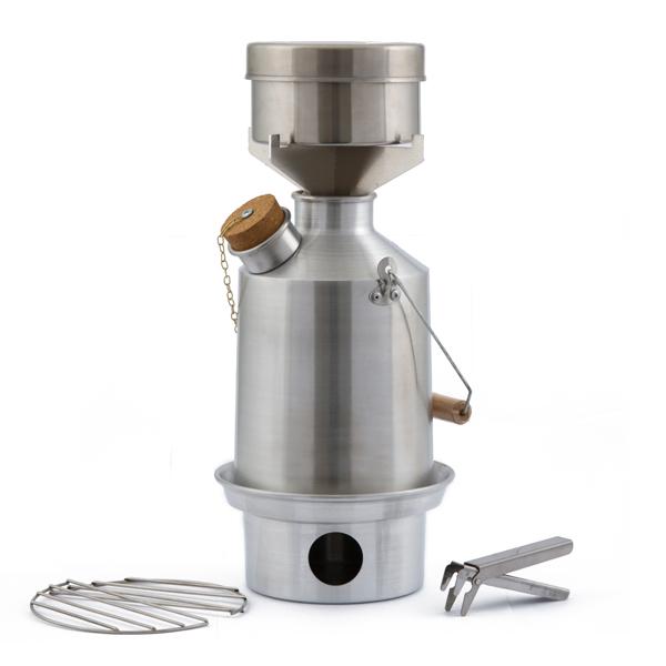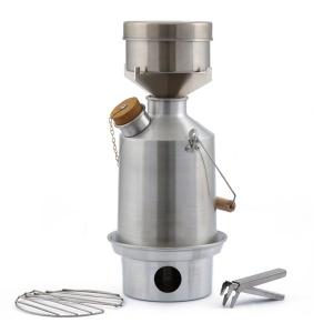 Kelly Kettle – a highly efficient 1.1 litre aluminium kettle, cook set and pot support which all fit neatly together into their own drawstring carry bag. Using any naturally occurring solid fuel (sticks, pine cones, dry camel dung) to make a quick, easy and contained fire to boil water and heat food. Joe loves the Kelly Kettle, being able to make hot cups of tea quickly and easily first thing in the morning using only poor fuels like leaves and twigs is heaps of fun. He likes the simplicity and efficiency of the Kelly Kettle design and the fact the fuel is free and so readily available even when good fuel has been depleted in popular camping areas. Chuck the fuel in the fire base, light it up and put the kettle on top. In a few minutes it’s boiled. The pot can mount on top of the kettle to heat food whilst heating water, or the kettle can be removed with the pot placed directly on the fire base. This is good only for gentle heating, since the fire is only small. We’ve used it to fry a couple of eggs and sausages, took a while though.