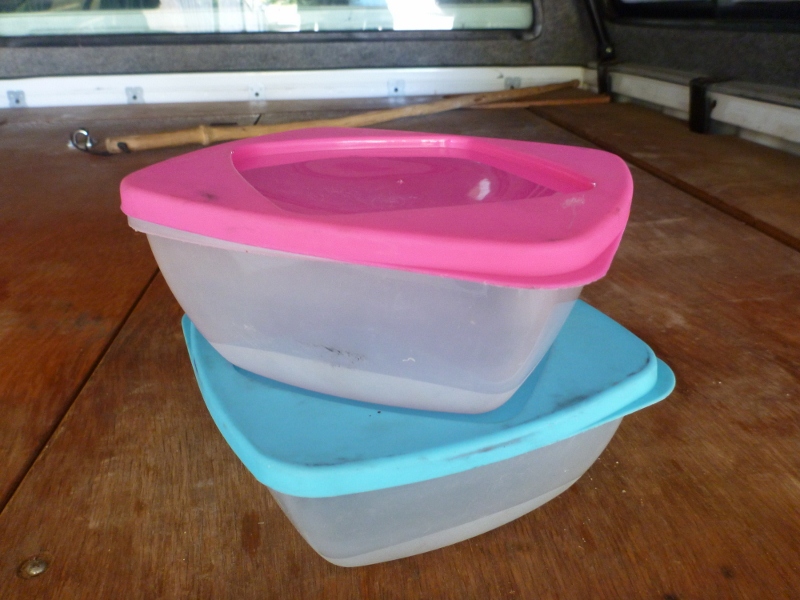 Cheap plastic containers – we bought these a couple of months into our tour around Australia, as we found the couple of tupperware containers weren’t enough. Sometimes we’d use a container or two for freezing some fresh fish or leftovers, which meant we had nothing left for any further leftovers. So we got these cheap containers from the red dot store in Esperance. Pretty flimsy but they’re cheap, lightweight and work ok as a backup container when we’re camping.