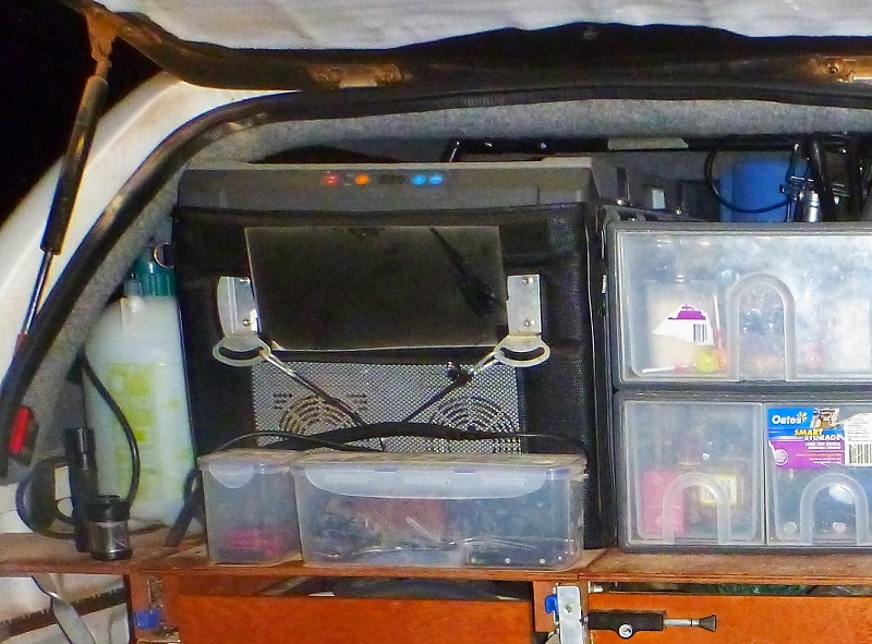 Snap Lock Containers – these containers house our most commonly used cutlery. They utilize the space behind our fridge, the fridge being set forward because of our sleek profile canopy. They are secured to the slide out fridge shelf with velcro. The small container to the left holds our MSR scraping brushes, some matches and a cigarette lighter. We are using standard cutlery, no special camping utensils.